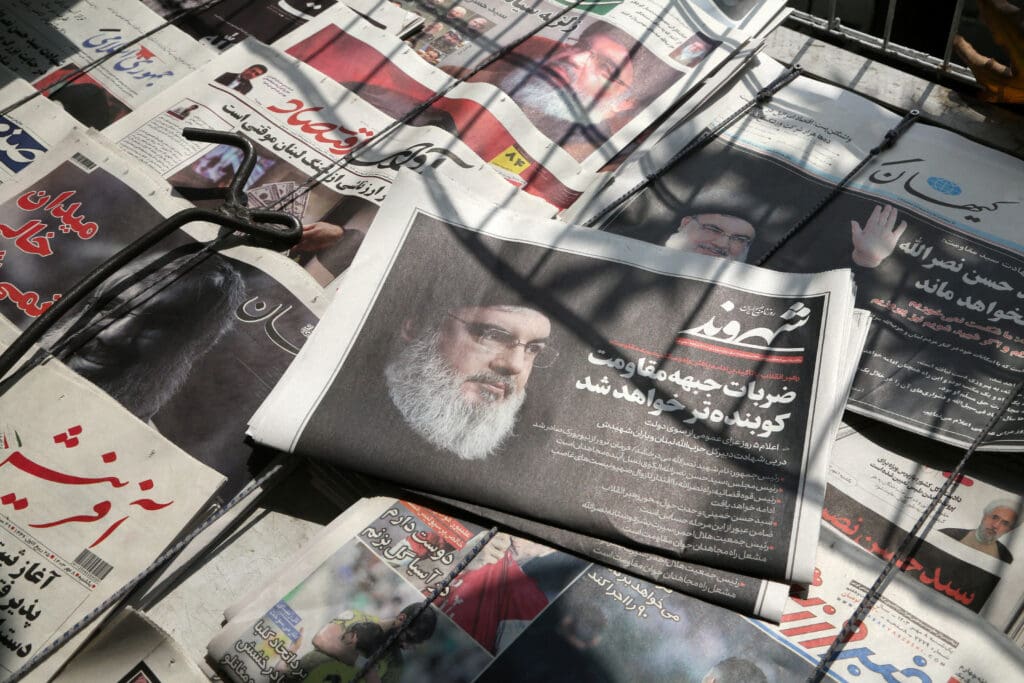 A view of the front pages of the newspapers featured news about the death of Hezbollah Leader Hassan Nasrallah in an Israeli strike in the Lebanese capital on Friday, at a store in Tehran, Iran on September 29, 2024. (Photo by Fatemeh Bahrami / ANADOLU / Anadolu via AFP)