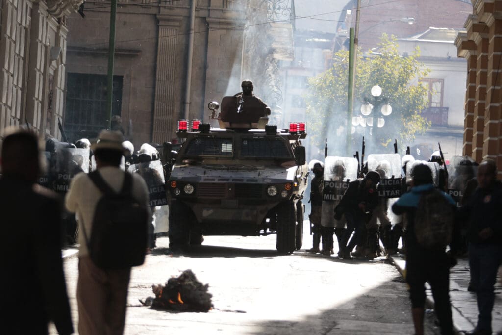 Supporters of the government of Luis Arce Catacora confront the military who surrounded the Murillo square where the Government Palace is located in an alleged coup d'etat, in La Paz, Bolivia on June 26, 2024. Mateo Romay Salinas / Anadolu (Photo by Mateo Romay Salinas / ANADOLU / Anadolu via AFP)