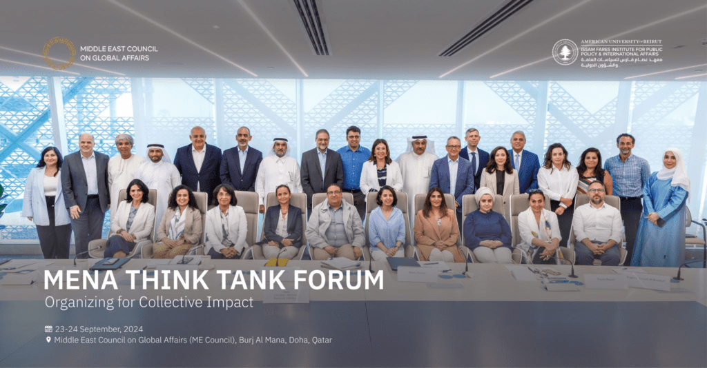 Doha, Qatar – The Middle East and North Africa (MENA) Think Tank Forum, co-hosted by the Middle East Council on Global Affairs (ME Council) and the Issam Fares Institute for Public Policy and International Affairs (IFI) at the American University of Beirut, concluded successfully in Doha on September 24, 2024. The two-day event brought together leading think tanks from across the Arab region to address critical challenges impacting the region and to explore strategies for deeper institutional collaboration.